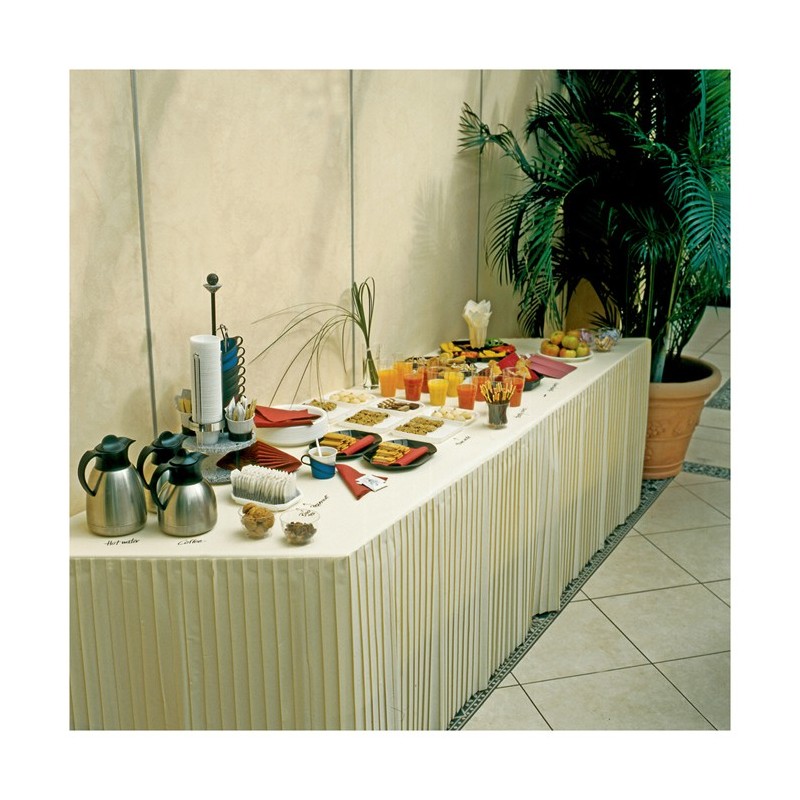 Grâce au juponnage plissé jetable, on peut réaliser des tables de buffets de grande classe, tout en évitant les corvées de lavage et surtout de repassage du linge plissé traditionnel.