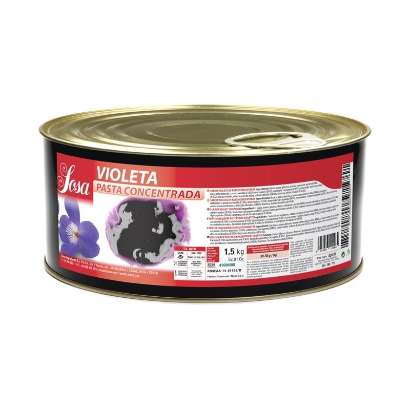 Pâte de violette. Ingrédients: Sucre, eau, glucose, arômes, épaississants : pectine (E440ii), colorants naturels : carmin de cochenille (E120) et anthocyanines (E163), épaississant : carraghénane (E407), conservateurs : sorbate de potassium (E202), citrate de sodium, huile essentielle de mûre, diphosphate disodique (E450i), dextrose, orthophosphate tricalcique (E341iii).