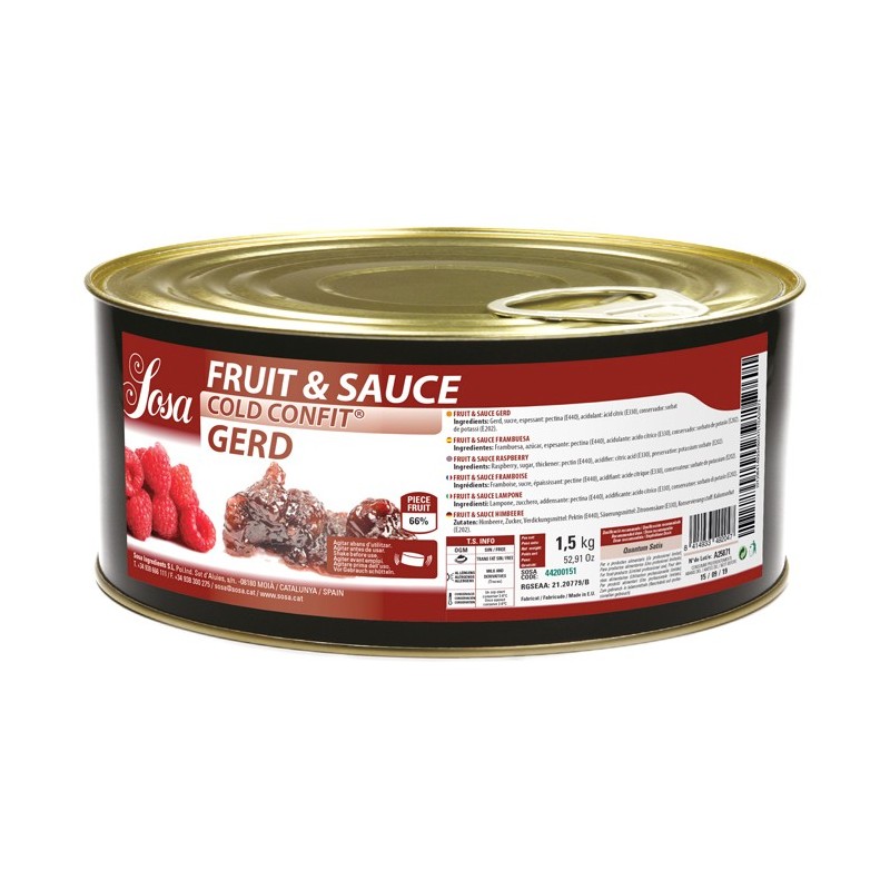 Fruits semi-confits, conservés dans un sirop de fruits. Ingrédients: Framboises, sucre, épaississant : pectine (E440), acide citrique (E330), conservateur : sorbate de potassium (E202).