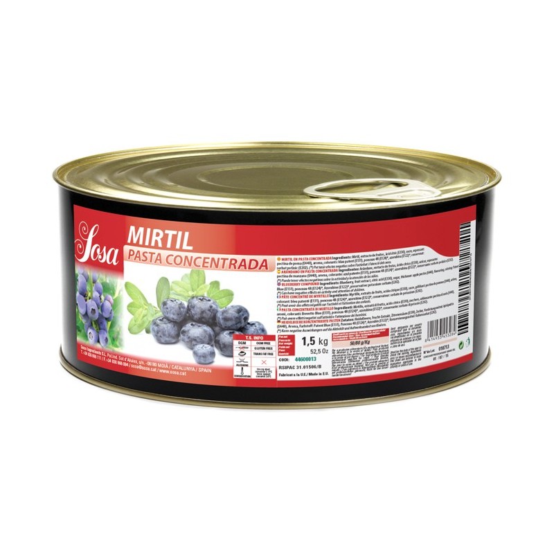 Pâte de myrtilles. Ingrédients: Myrtilles, extrait de fruit, acidifiant : acide citrique (E330), colorant naturel : anthocyane (E163), sucre, épaississant : pectine (E440ii), maltodextrine, concentré de baies de sureau, sirop de caramel, arôme naturel, conservateur : sorbate de potassium (E202) sorbitol (E420ii), diphosphate disodique (E450), dextrose, phosphate tricalcique (E341iii)