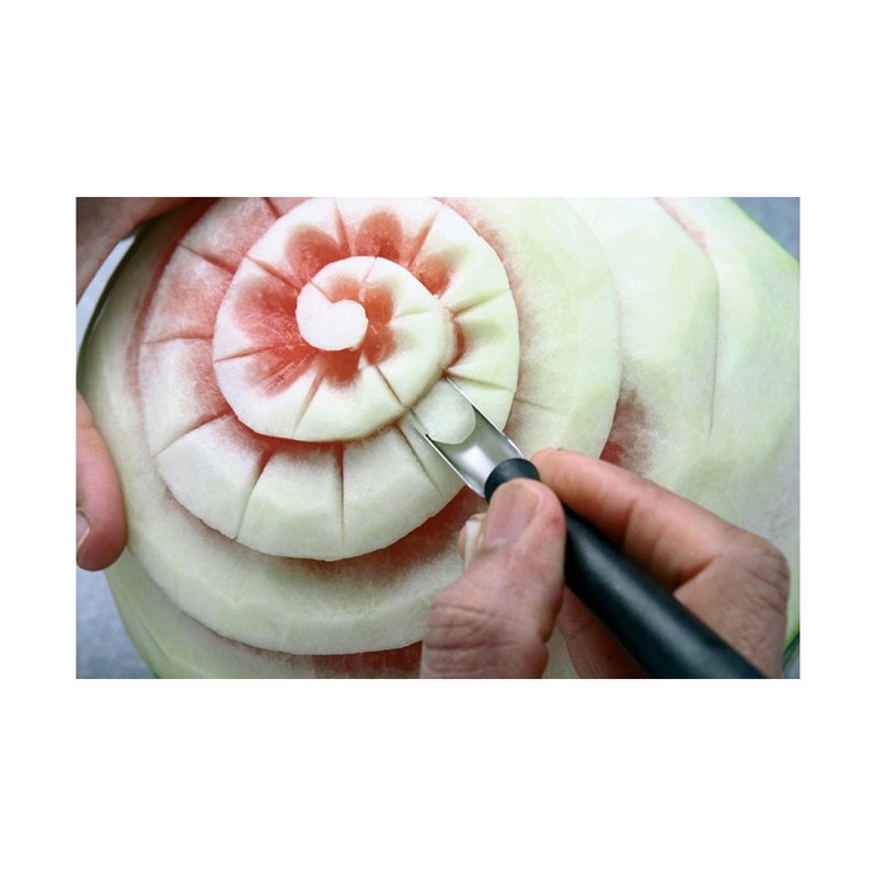 Composée de 8 outils dont un mini-aiguiseur pour entretenir le fils des 7 autres. Permet de réaliser des découpes et sculptures très fines dans les légumes et fruits à chaire dure. Lames en acier inoxydable trempé. Manche en polypropyléne.