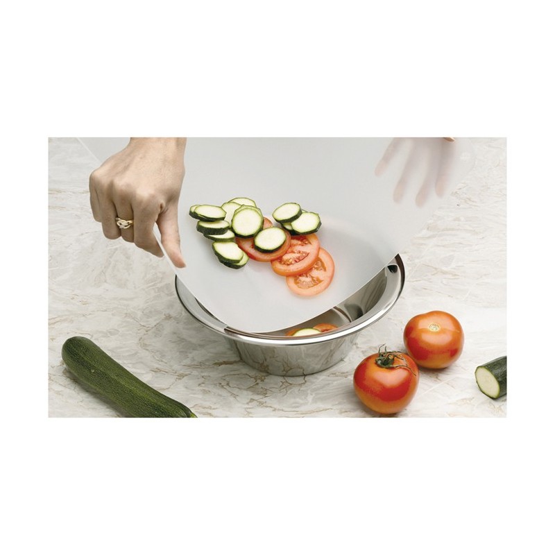 La plaque est facilement dissociable et permet de transvaser les aliments coupés dans un récipient.