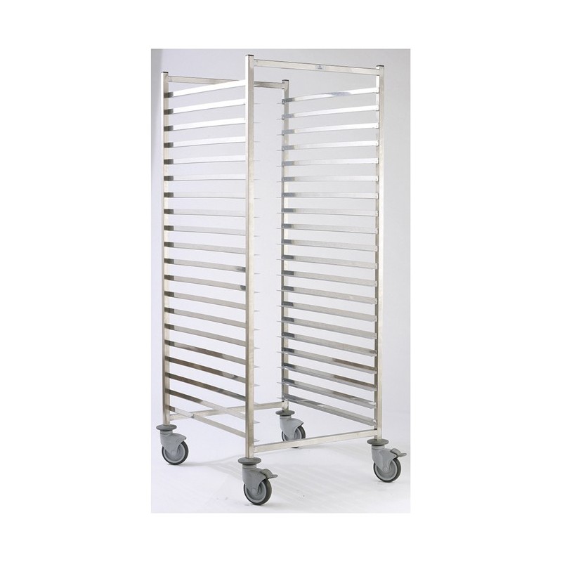 Entrée 600 mm. Glissières sans butées, espacées de 75 mm. Structure en tube carré 25 x 25 mm en acier inoxydable. 4 roues composite pivotantes dont 2 avec freins.