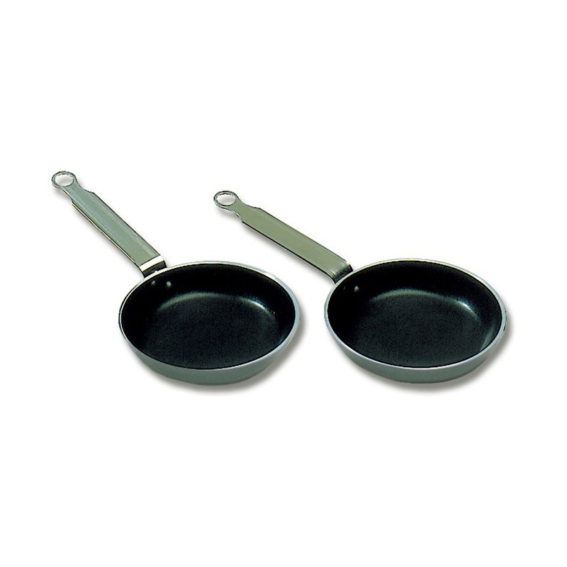 Poêles en aluminium extra-fort, revêtement anti-adhésif 4 couches. Jupe extérieure laquée grise facile à nettoyer. Queue fixée par 3 rivets (sauf poêle à blinis, 2 rivets). Queue large en acier inoxydable. Fond rayonné. Toutes les les poêles anti-adhérentes Matfer sont garanties revêtement sans PFOA. Poêle utilisable tous feux sauf induction.