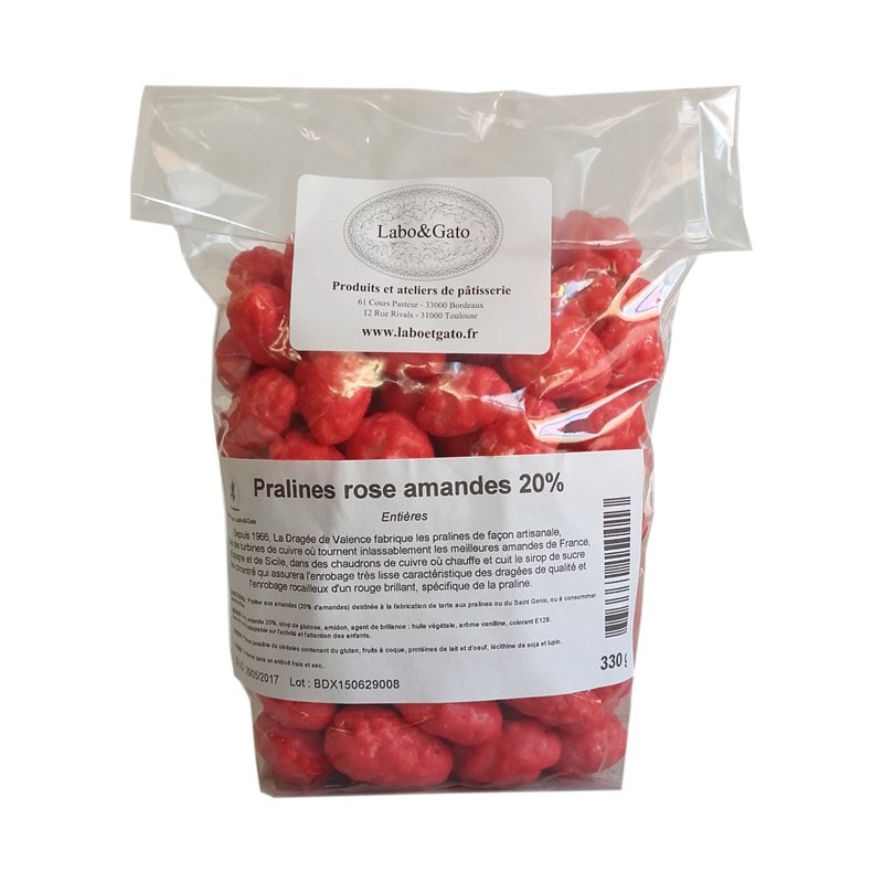 Ingrédients : sucre, amandes 20%, sirop de glucose, amidon, agent de brillance : huile végétale, arôme vanilline, colorant E129.