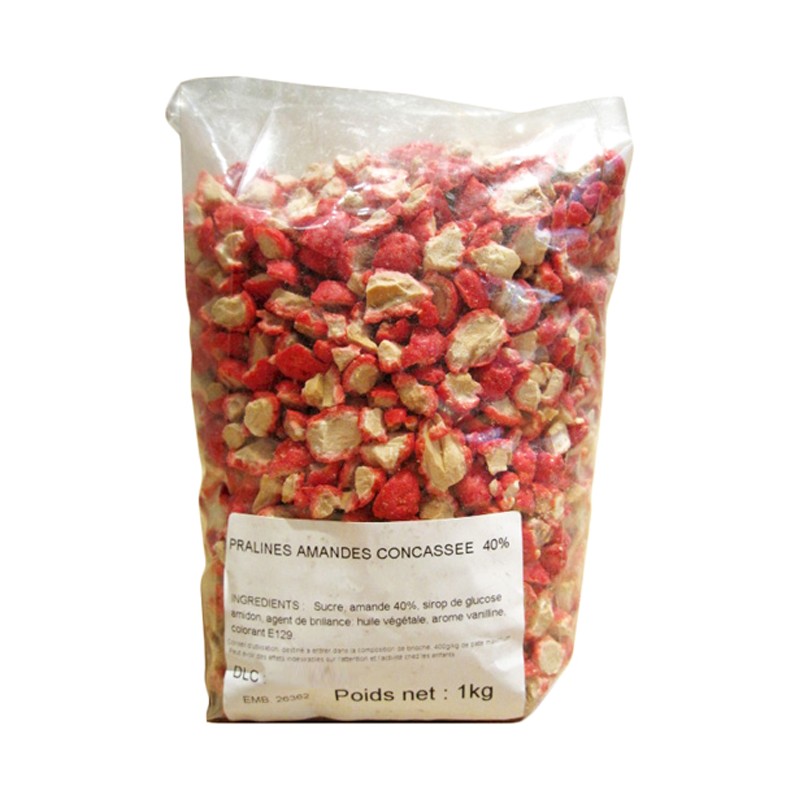 Ingrédients : sucre, amandes 40%, sirop de glucose, amidon, agent de brillance : huile végétale, arôme vanilline, colorant E129. Peut avoir un effet indésirable sur l'activité et l'attention des enfants.