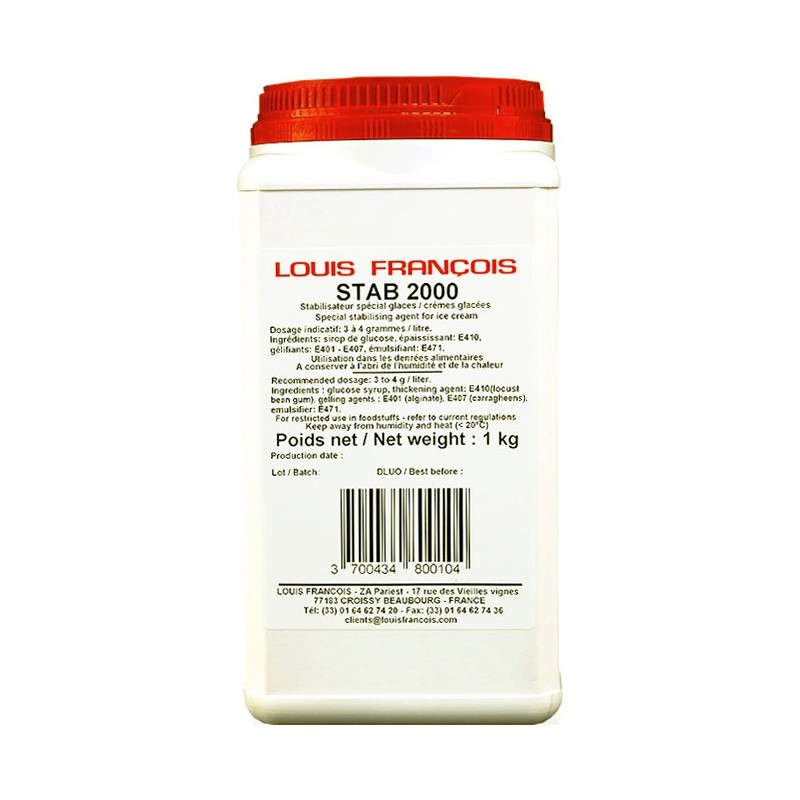 Stab 2000 est un stabilisateur principalement utilisé pour les crèmes glacées. Il présente de nombreux avantages : il stabilise la structure aqueuse du mélange en empêchant la formation de cristaux de glace, améliore la viscosité du mix ainsi que le corps et la texture des produits finis, il donne de l'onctuosité, favorise le foisonnement, améliore la dispersion des matières grasses et émulsionne les différents constituants des mix.