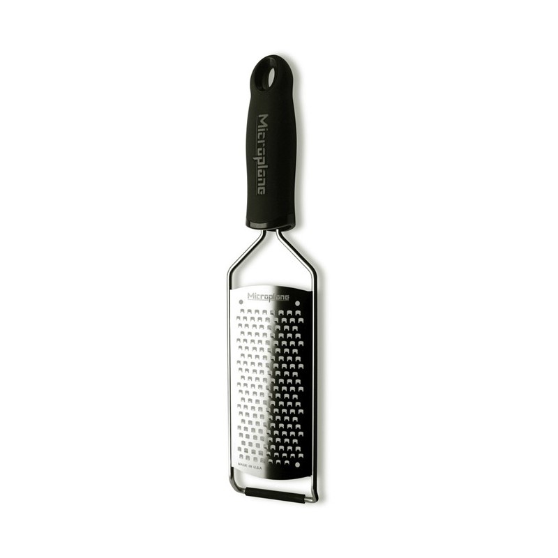 Râpe large ergonomique, manche ergonomique noir, toucher velours avec embout caoutchouc anti-dérapant pour une stabilité renforcée.