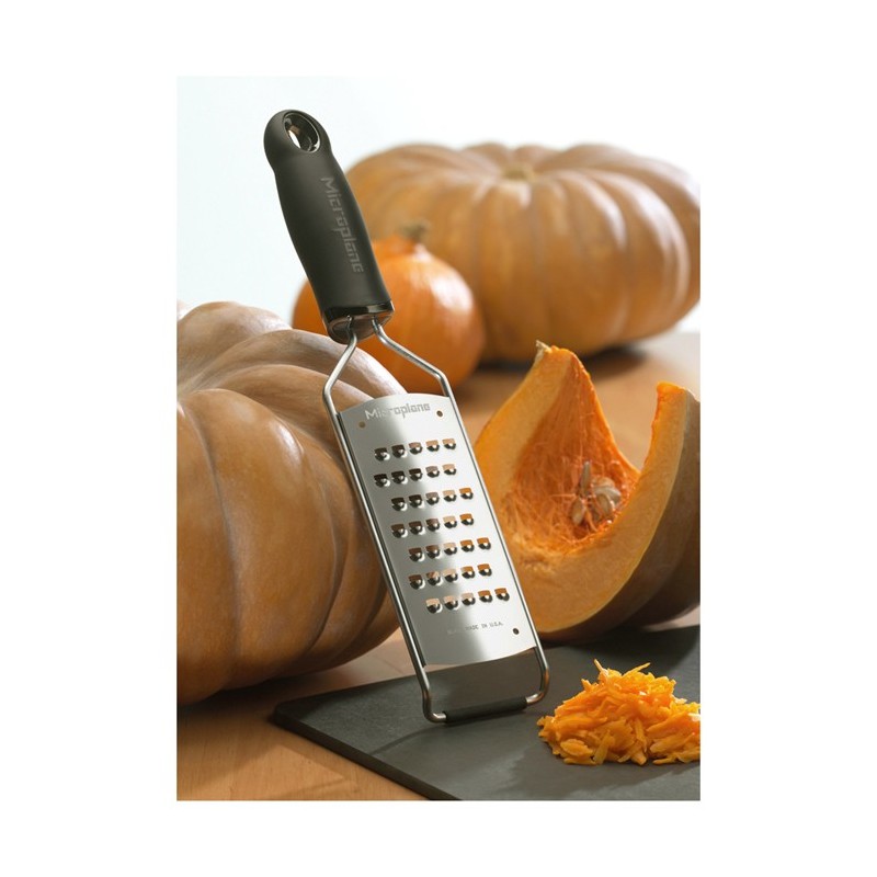 Râpe large ergonomique, manche ergonomique noir, toucher velours avec embout caoutchouc anti-dérapant pour une stabilité renforcée.