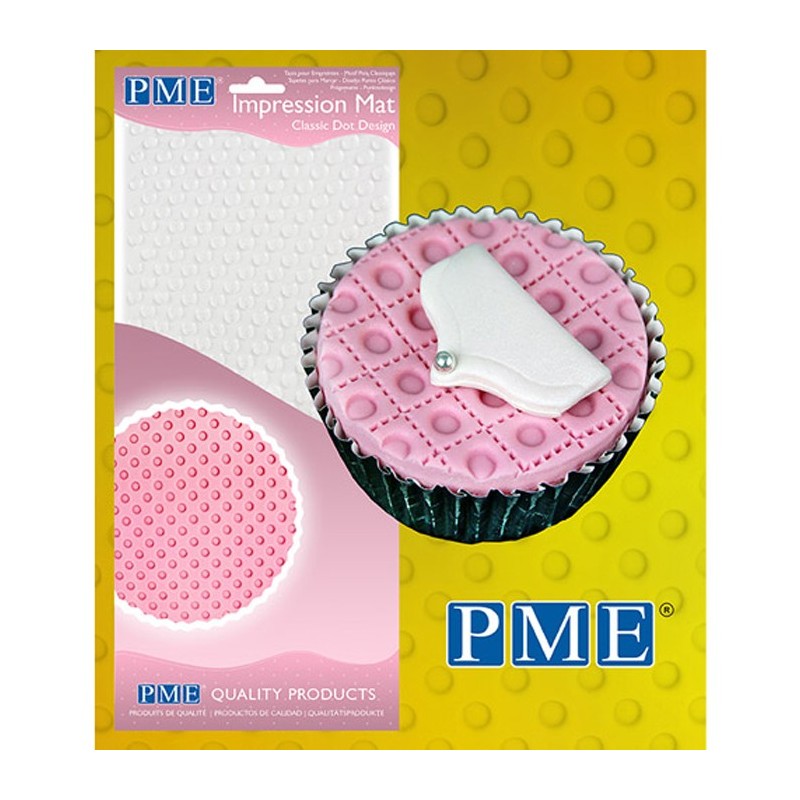 Créer des motifs pois classiques magnifiques avec le PME Tapis d'Impression. Le tapis est idéal pour utiliser avec : fondant, pâte à modeler, pâte à sucre, ou pâte d'amandes. Les deux côtés du tapis peuvent s'utiliser pour la réalisation de motifs. D'un côté vous obtenez un motif en relief sur le fondant, si vous utilisez l'autre côté du tapis vous obtenez un motif en profondeur.