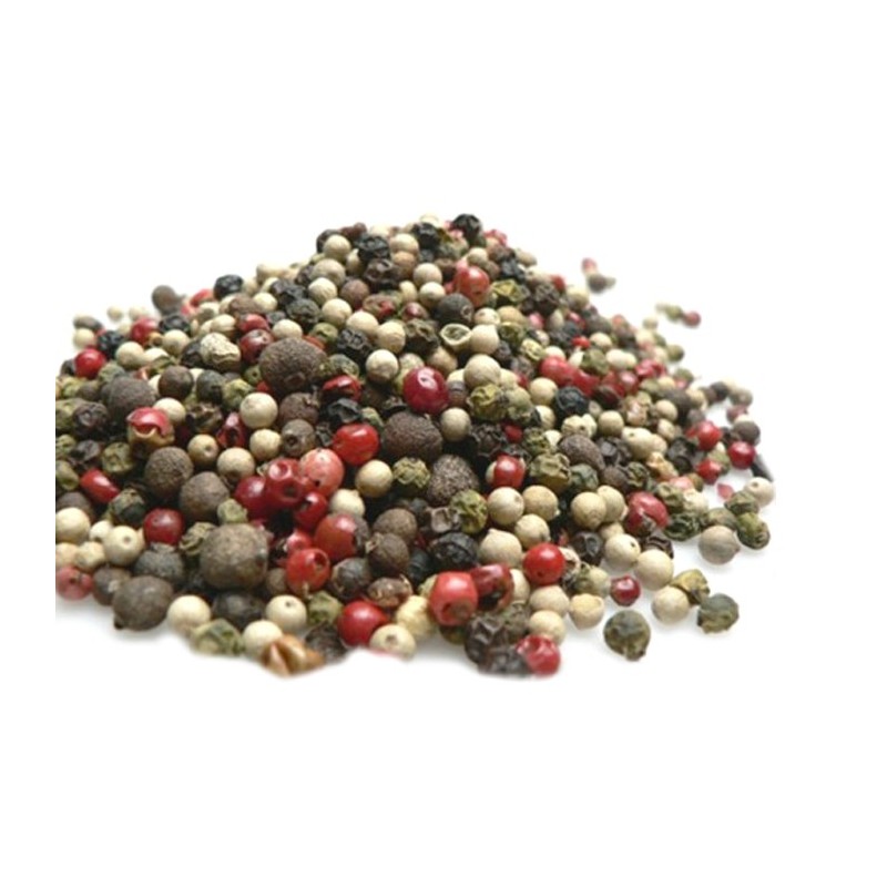 Ingrédients : poivre blanc, poivre noir, poivre vert, baies roses, piment du Mexique.
