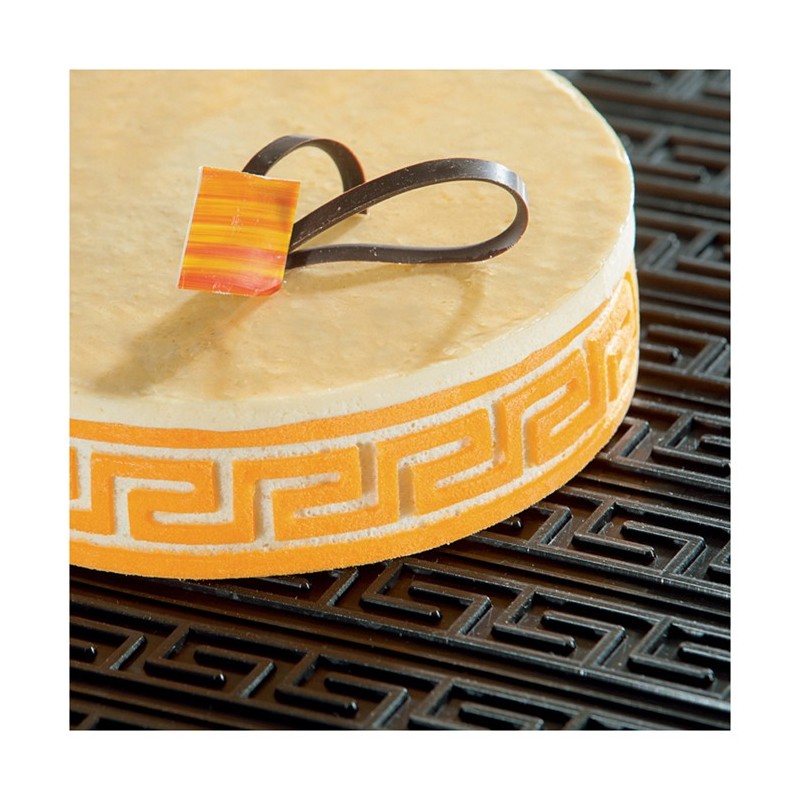 1. Préparer une pâte à cigarette. Poser le tapis sur une plaque perforée 600 x 400 mm (code 310612). Étaler la pâte à cigarette colorée selon votre goût sur le tapis au ras des reliefs. Bien lisser à hauteur des motifs. Passer au froid.