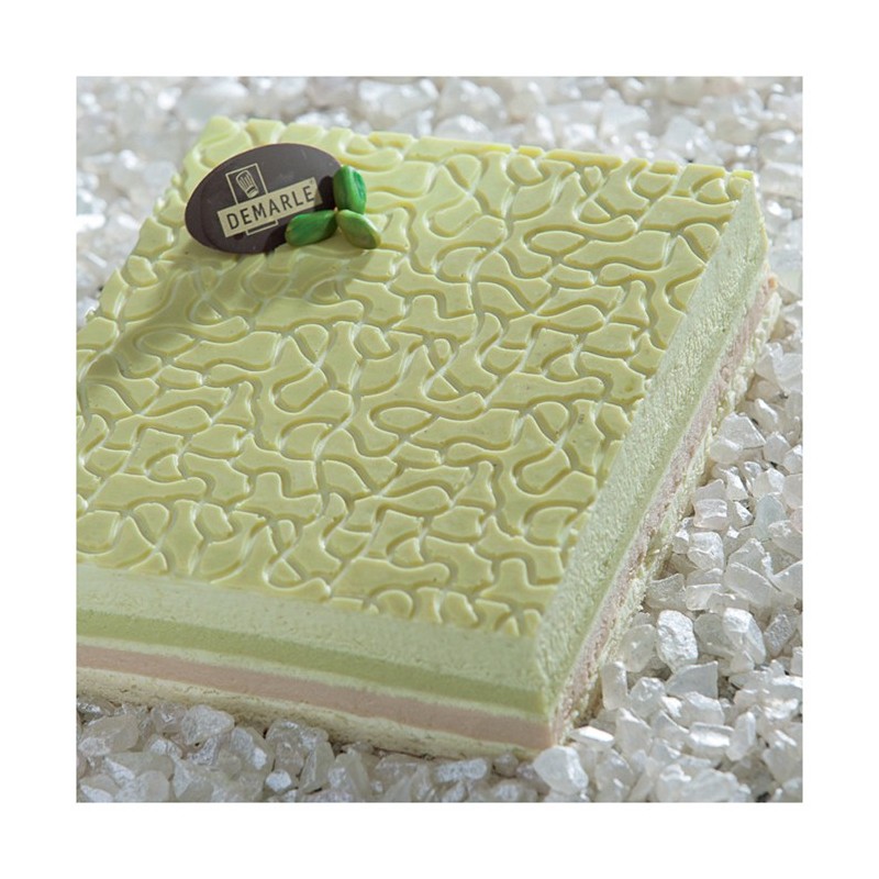 1. Préparer une pâte à cigarette. Poser le tapis sur une plaque perforée 600 x 400 mm (code 310612). Étaler la pâte à cigarette colorée selon votre goût sur le tapis au ras des reliefs. Bien lisser à hauteur des motifs. Passer au froid.