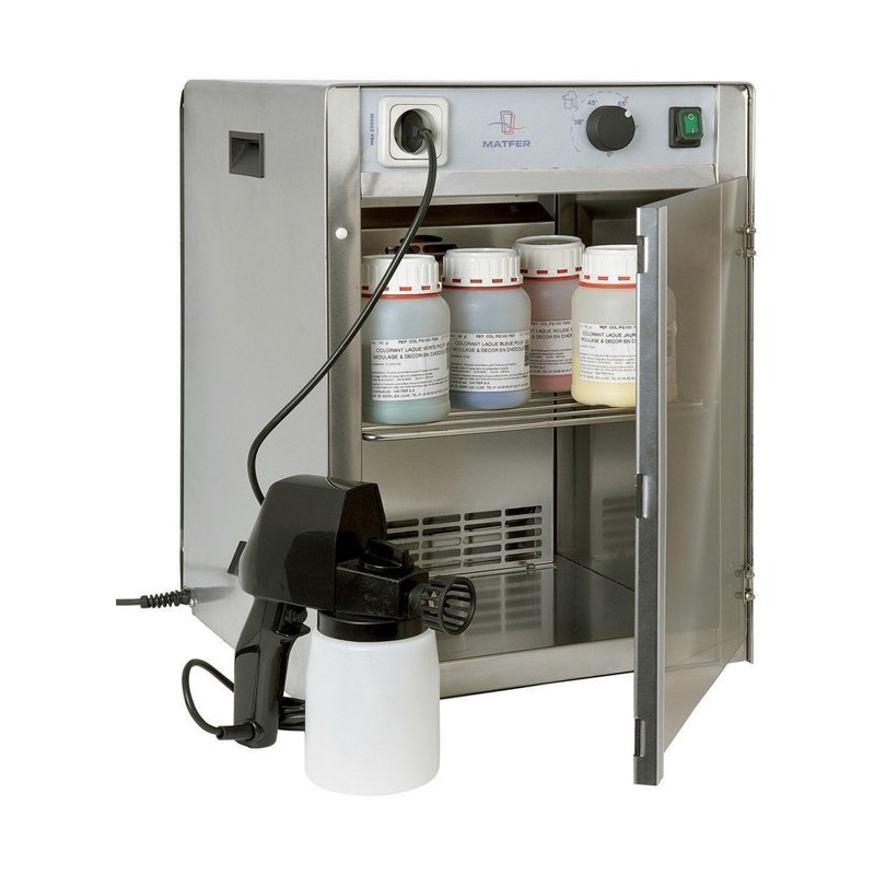 Cabine chauffante pour le maintien au chaud des siphons à espumas "Gourmet ISI", des pistolets pâtissiers et à chocolat, des colorants à chocolat.