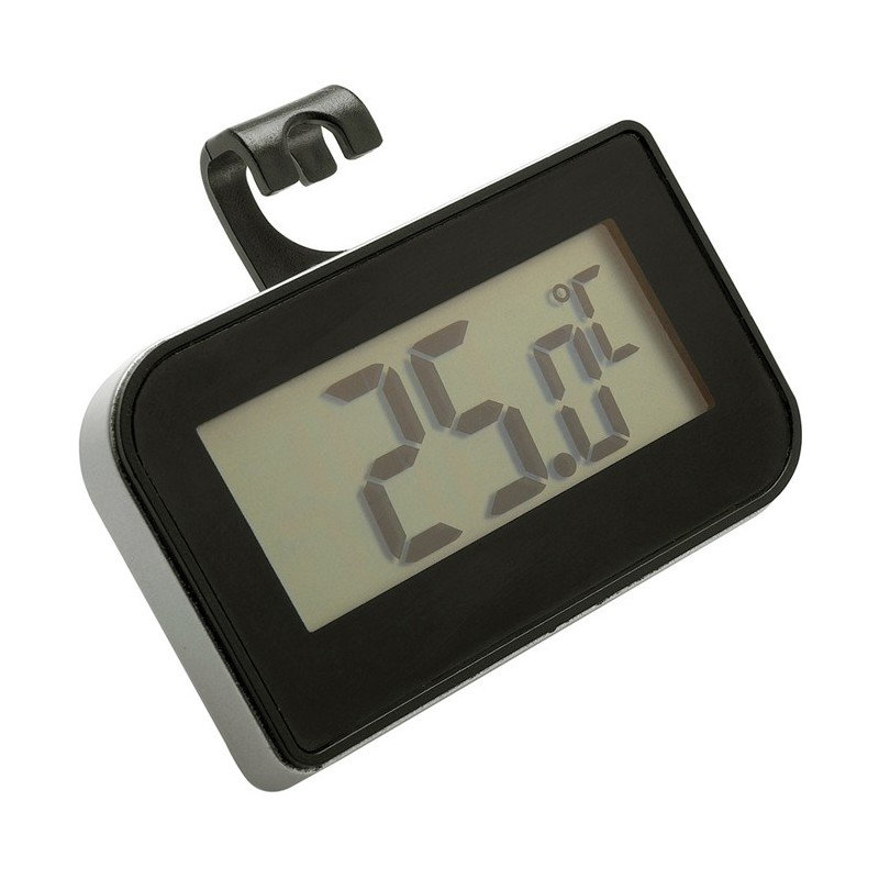 Thermomètre compact muni d'un crochet, avec grand écran digital.