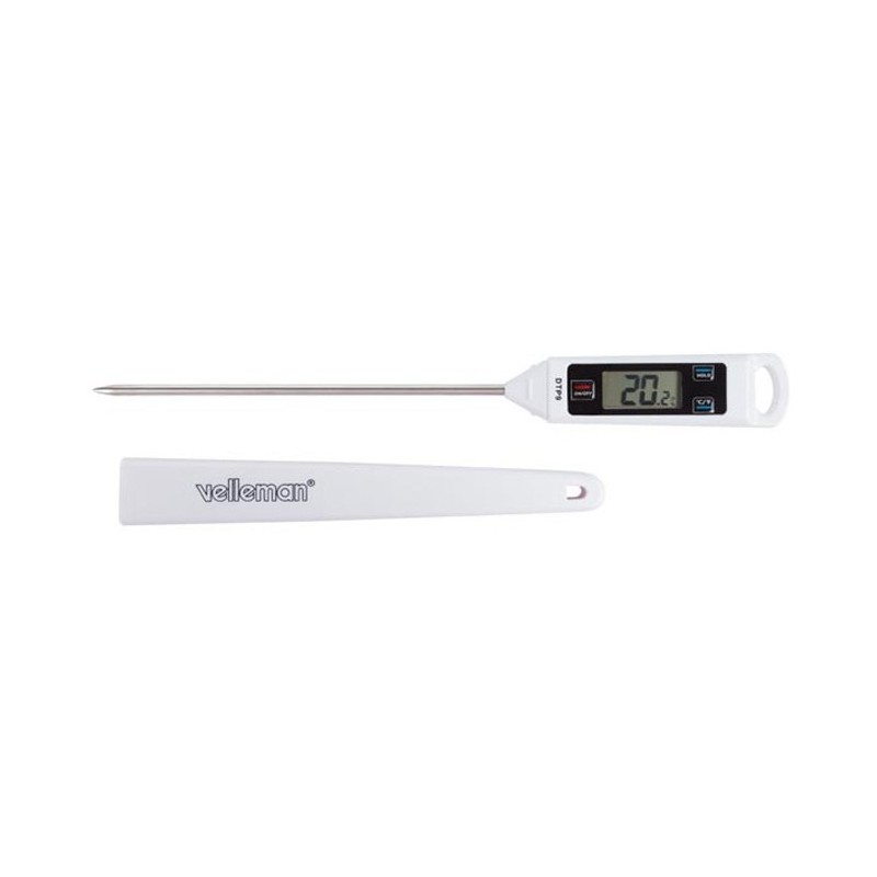 Thermomètre de cuisson à sonde électronique en inox permettant de mesurer la température des liquides (crème anglaise, sirop de sucre, ...) et des solides (cuisson à coeur des viandes et des poissons).